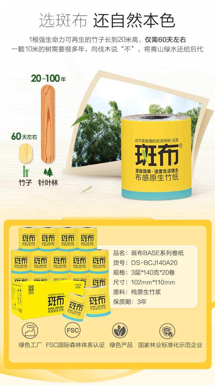 斑布(BABO) BASE系列卫生纸 竹纤维3层140g有芯 20卷